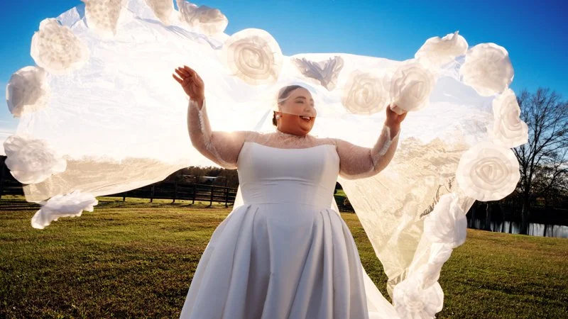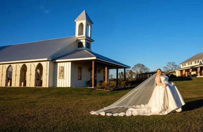 Analiese wore a stunning gown with a sheer, long-sleeve bodice and an elegant extended train, finished with delicate floral detailing. The combination of soft light, graceful design, and classic Southern scenery made for an unforgettable bridal portrait experience.